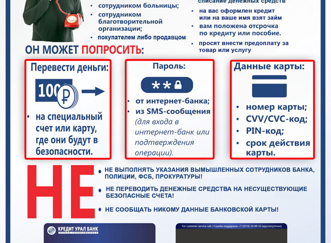• настоящий сотрудник банка, общаясь с Вами по телефону, не будет запрашивать пароли, CVV-коды и коды из СМС ни под каким предлогом. Так делают только мошенники;