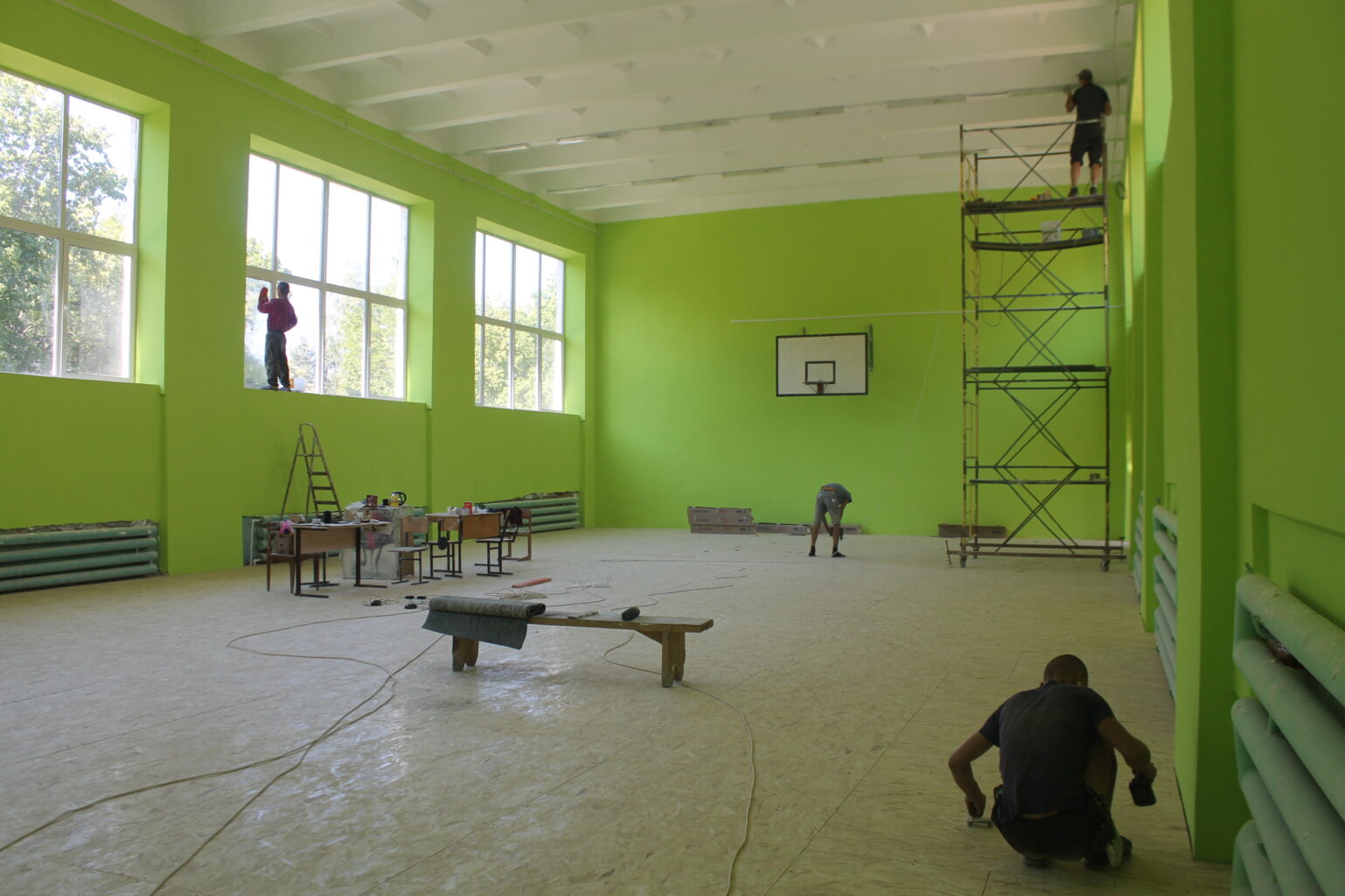 Полным ходом идет ремонт спортивных и актового залов, кабинета хореографии, рекреации всех этажей, кабинетов физики и химии, служебных помещений, учительской, канцелярии. В большом спортивном зале к системе отопления подведены новые коммуникации. В рекреациях окончены работы по подшивке потолков, начат ремонт полов.