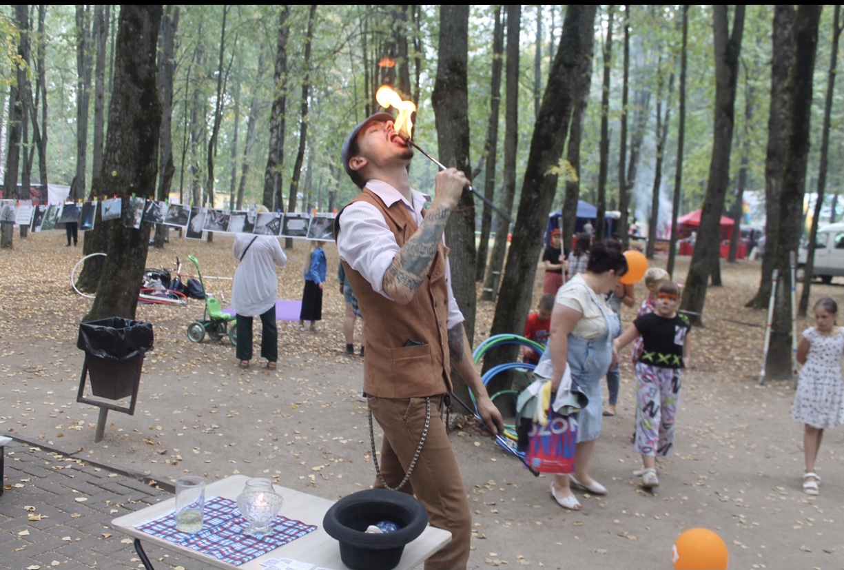 (К 5-му фото) Немало зрителей собралось на площадке ярцевского уличного театра «Маска». Выдыхание и глотание огня вводило в ступор, притягивало. Основным направлением театра является уличный перформанс — вид искусства, когда актер становится частью единого уличного представления, файер-шоу. Никита Чубалин знаком многим ярцевчанам не только как руководитель театра, но и как талантливый актер, человек, работающий с огнем. Подростки с удовольствием перенимают у него актерское мастерство.