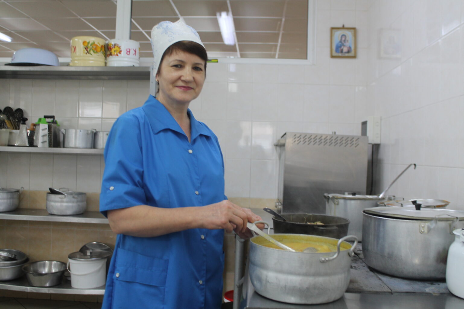 Именно благодаря труду Светланы Михайловны к открытию столовой всегда заполнен мармит (специальная пищевая емкость для кратковременного хранения приготовленных блюд в подогретом виде, — ред.), и любой желающий может получить полный обед. Как говорится, первое, второе и компот.