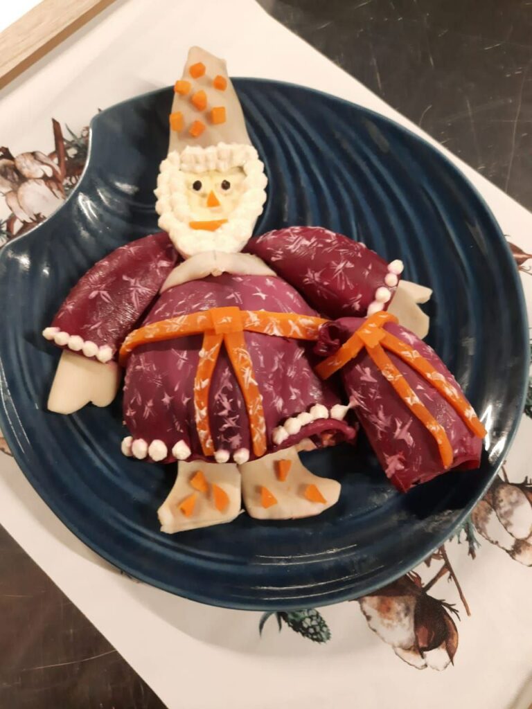 В нашем случае салат оформлен в виде объемной фигуры Деда Мороза – в красной праздничной шубе, колпаке, рукавицах, валенках и, конечно же, с мешком подарков.