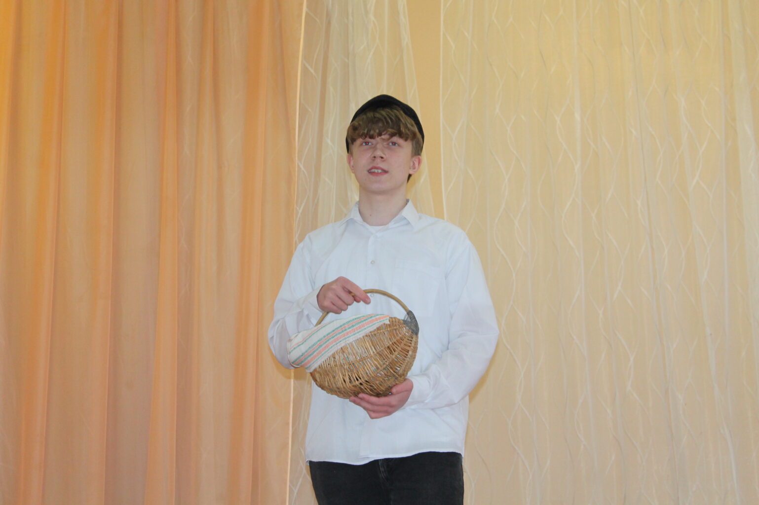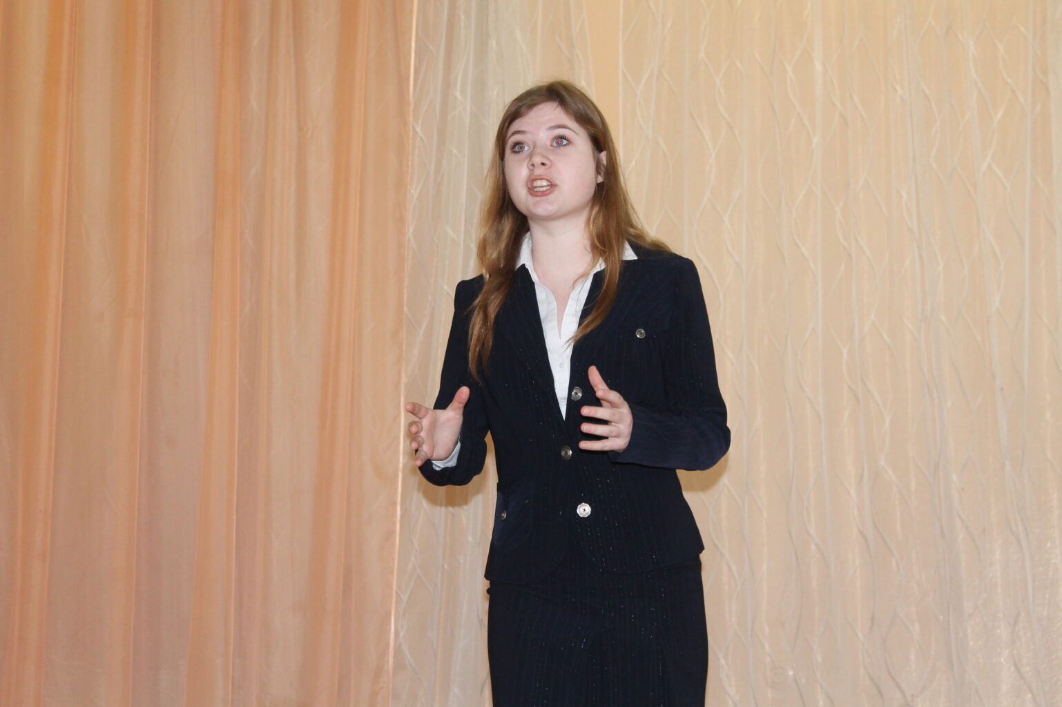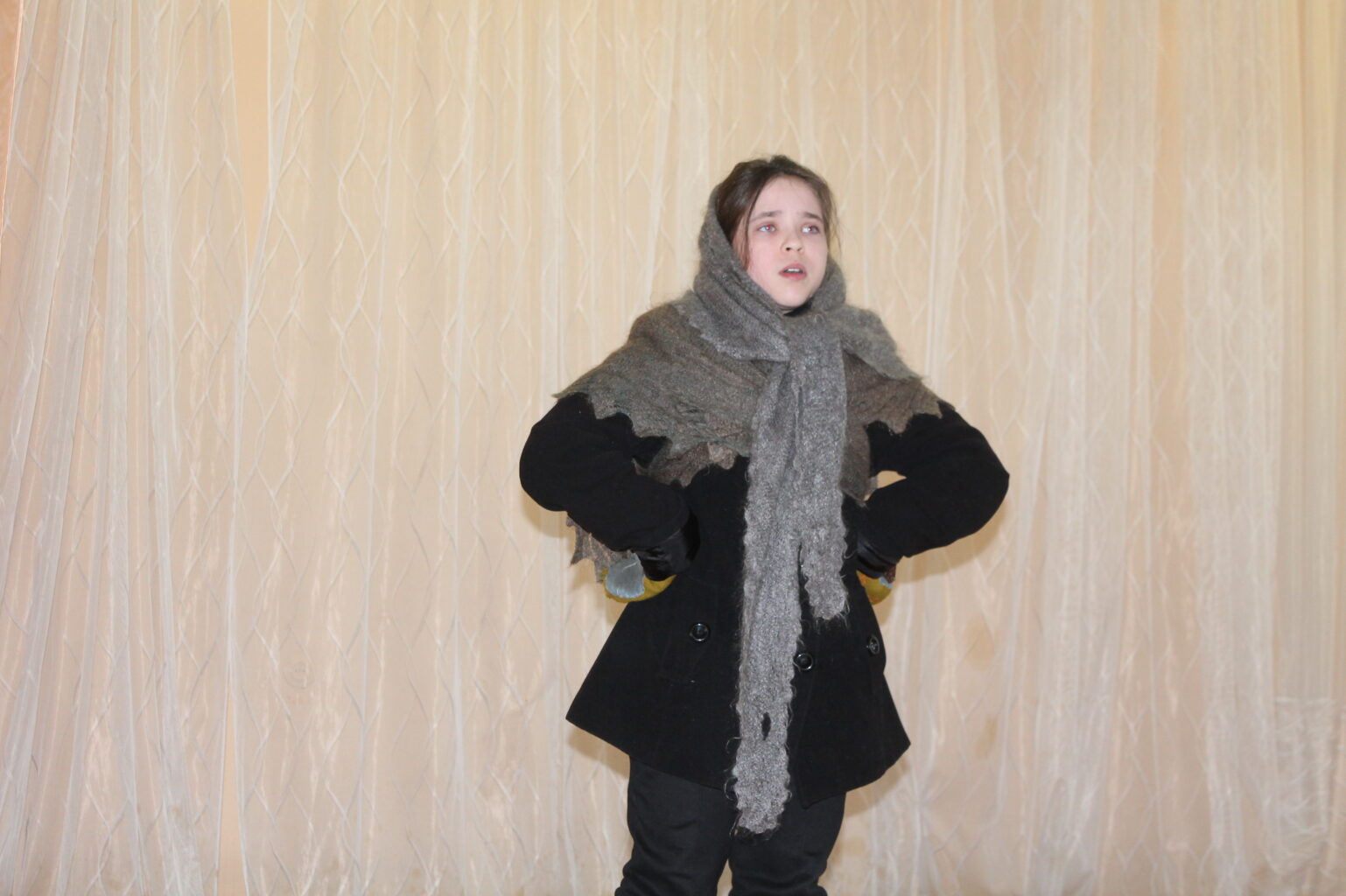 Повесть Тамары Цинберг «Седьмая симфония» впервые была опубликована в 1964 году и имела читательский успех, однако позднее не переиздавалась вплоть до 2015 года. Так что это произведение, отрывок из которого прочитала гимназистка Катя Баркова (педагог Татьяна Станиславовна Шпилева), воспринималось свежее многих рассказов о войне. А Кате вполне удалось создать образ самоотверженной и мужественной девочки, выживающей в блокадном Ленинграде. Помог в этом и костюм, выбранный для роли. Напомню: костюмы не являются обязательными, не оцениваются жюри и не дают дополнительных баллов, но на образ, безусловно, работают.