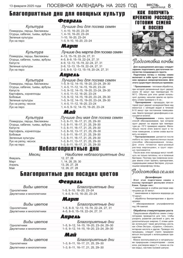 Посевной календарь на 2025 год.