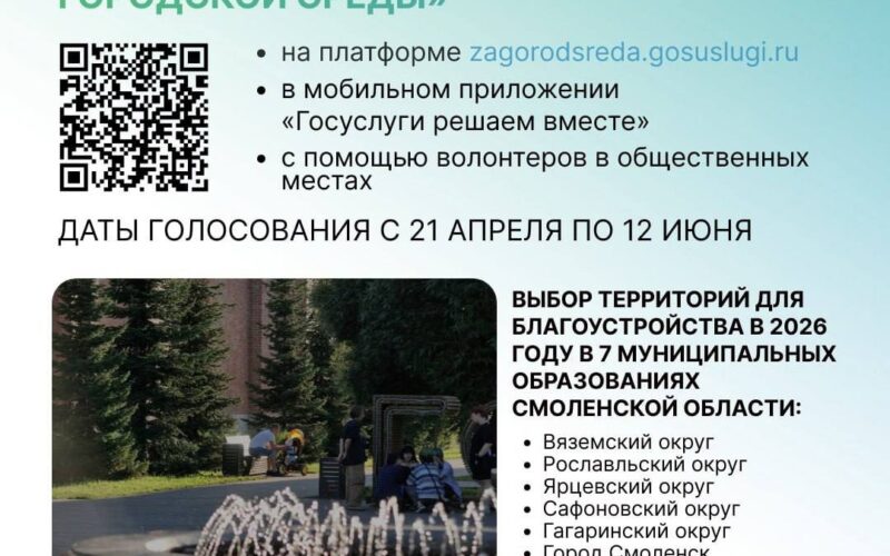 До 12 июня жители региона выбирают объекты благоустройства в Вяземском, Рославльском, Ярцевском, Сафоновском и Гагаринском округах, в Смоленске и Десногорске.