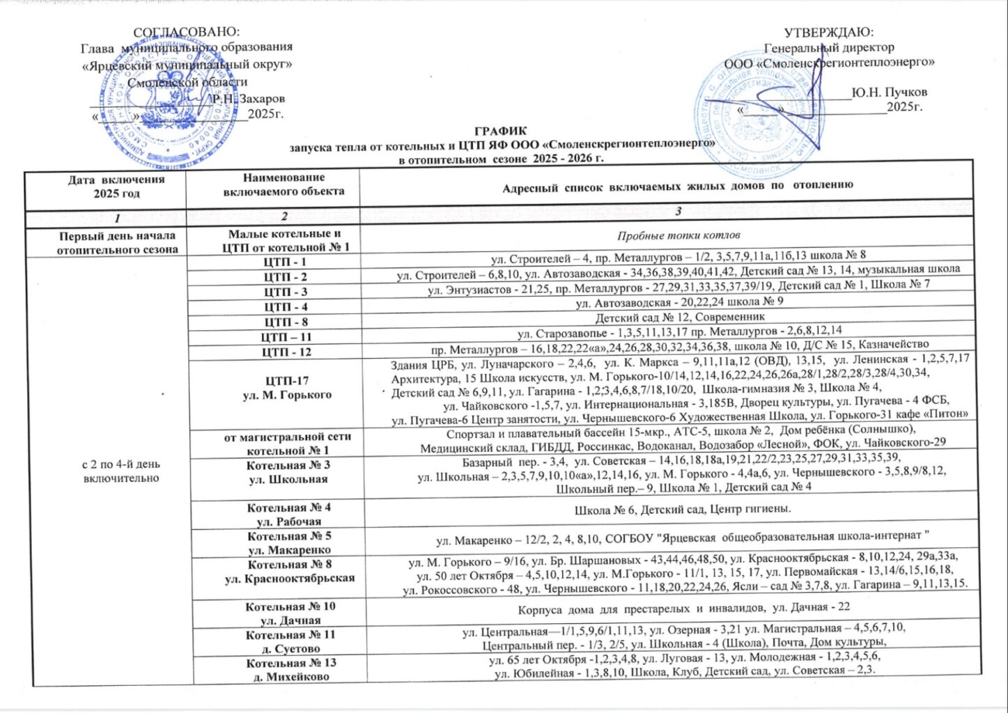 1. Теплоснабжающим организациям, обеспечивающим теплоснабжение потребителей тепловой энергии, с «29» сентября 2025 года начать отопительный период, обеспечив первоочередное поэтапное включение образовательных организаций, объектов здравоохранения и социального обслуживания с круглосуточным пребыванием людей.