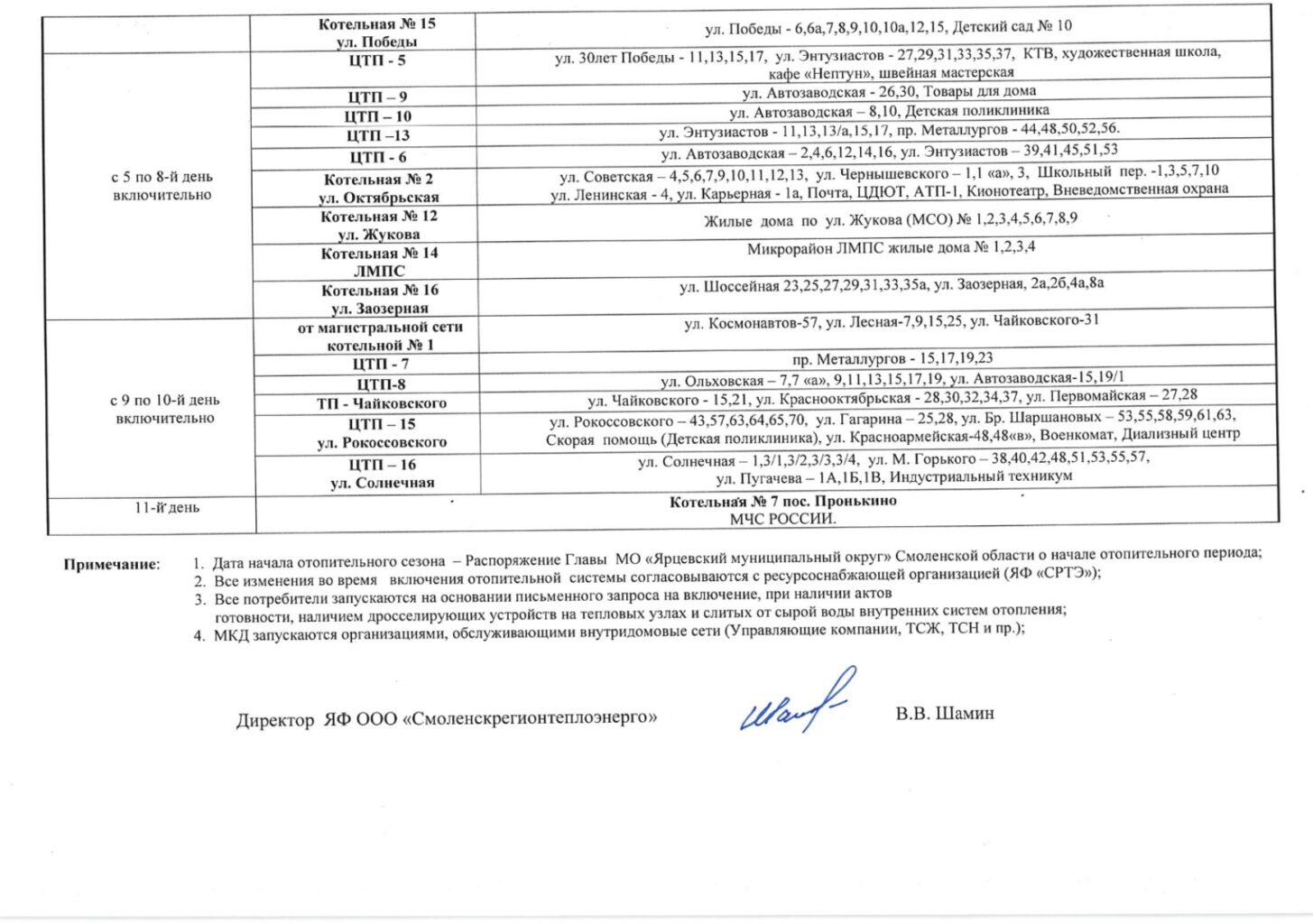 В соответствии с Федеральными законами от 06.10.2003 № 131-ФЗ «Об общих принципах организации местного самоуправления в Российской Федерации», от 27.07.2010 № 190-ФЗ «О теплоснабжении», п.5 Правил предоставления коммунальных услуг собственникам и пользователям помещений в многоквартирных домах и жилых домов, утвержденных постановлением Правительства Российской Федерации от 06.05.2011 №354, на основании анализа подробного прогноза погоды администрация муниципального образования «Ярцевский район» Смоленской области постановляет: