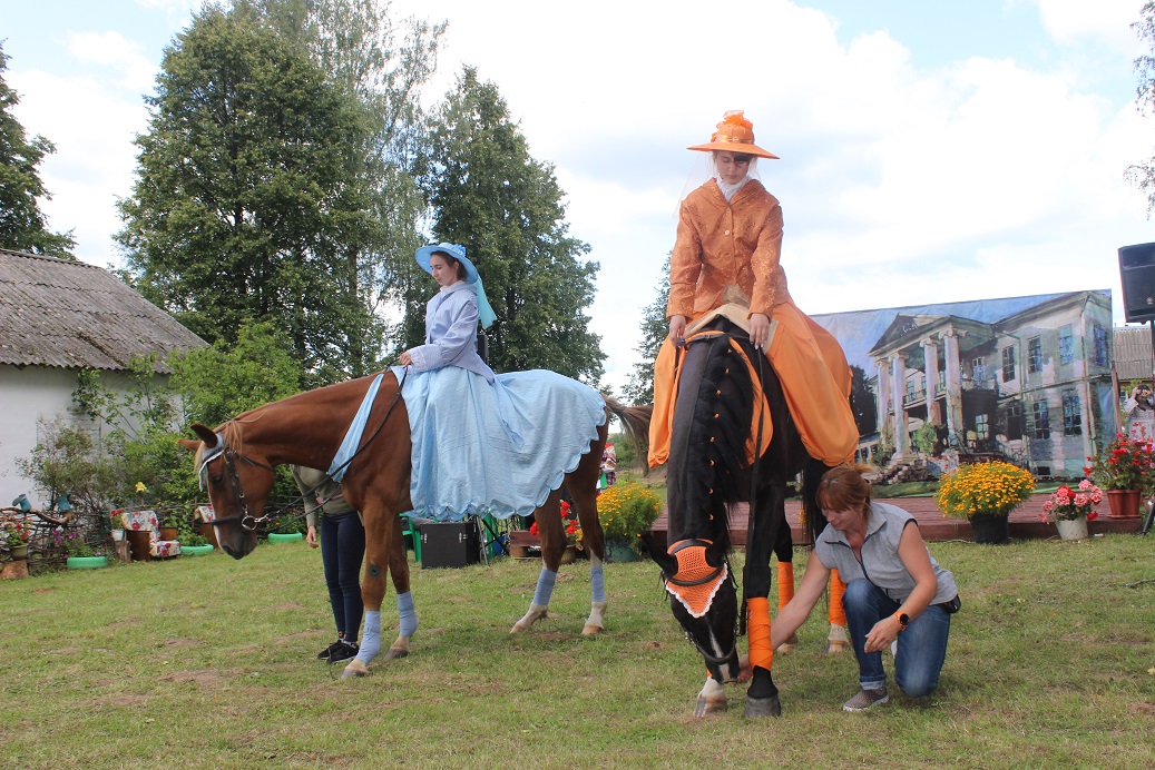 Русские красавицы, будто бы вернувшиеся к нам из прошлого столетия в ярких нарядах с веерами и ажурными зонтиками в руках, шествовали по деревне, присаживались за столики с узорными скатёрками, установленные на фоне Энгельгардтовской беседки, и как бы свысока посматривали на всё происходящее. На территории проводимого праздника было организовано множество фотозон, где желающие могли запечатлеть себя в окружении старинных вещей. Хуторские казаки за плетёным забором демонстрировали умение и ловкость владения саблей. А наездницы из конно-спортивного клуба «Серпантин» продемонстрировали грациозный выезд великосветских дам, умеющих хорошо держаться в седле. Затем все желающие с удовольствием покатались на лошадках.