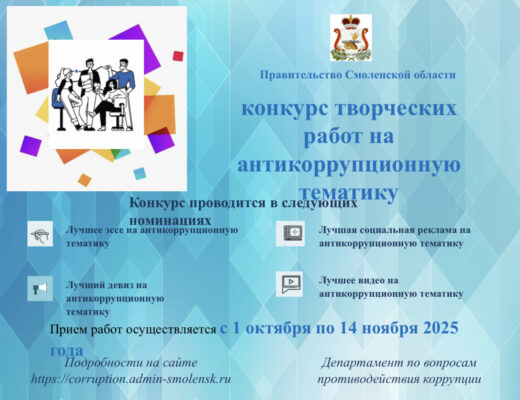 ПРЕСС-СЛУЖБА ПРАВИТЕЛЬСТВА СМОЛЕНСКОЙ ОБЛАСТИ214008, Смоленская область, город Смоленск, пл. Ленина, д. 1region@admin-smolensk.ru Конкурс на антикоррупционную тематику В целях выявления и поддержки талантливой молодежи среди обучающихся образовательных организаций, расположенных на…